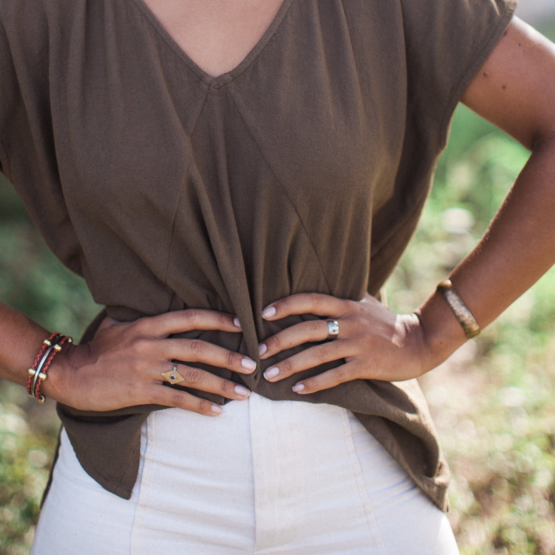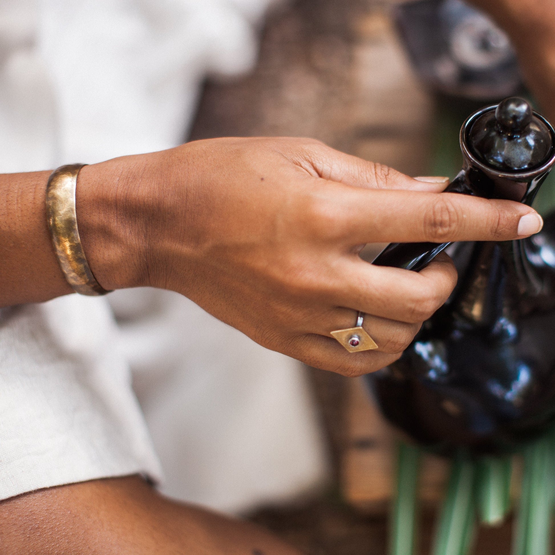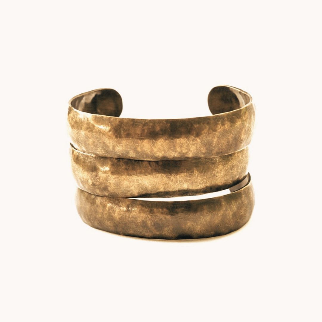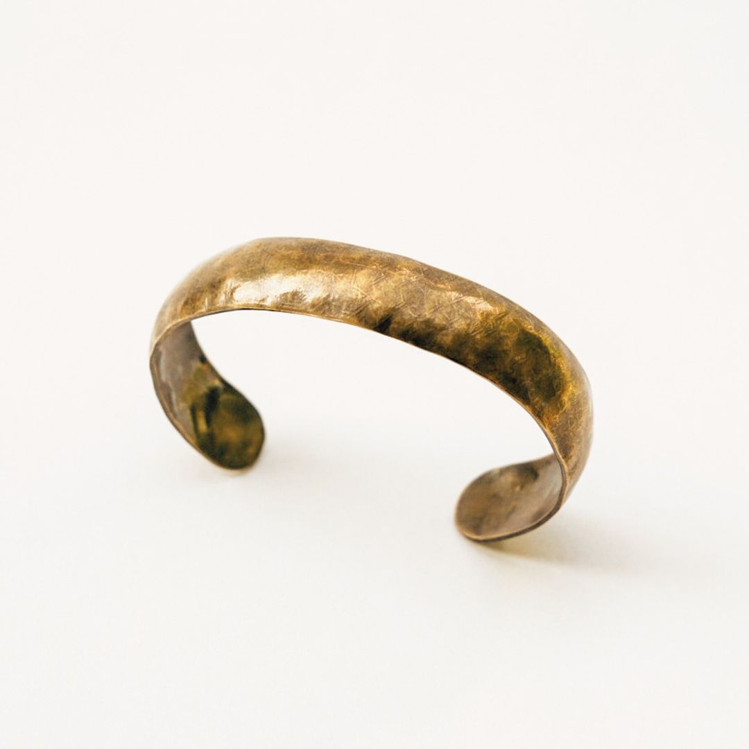 "The Eshe Cuff is a simple piece that makes a surprisingly big impact. I wear mine flipped so the opening faces up on the top of my wrist, framing my watch. It looks so elegant and chic in photos and real life! Its rounded lines make this the most comfortable, wearable cuff. The texture is special because every hammering and etching was put there by hand. Love it!"