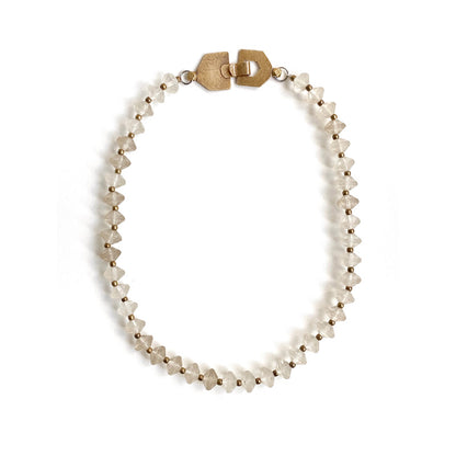 The Ayla necklace carries the weight and elegance of something that would have been traded along the caravan routes through the ancient city of Petra. It features beautiful glass & bronze beads and a unique clasp that can be worn at the front or back. A treasure from another time.