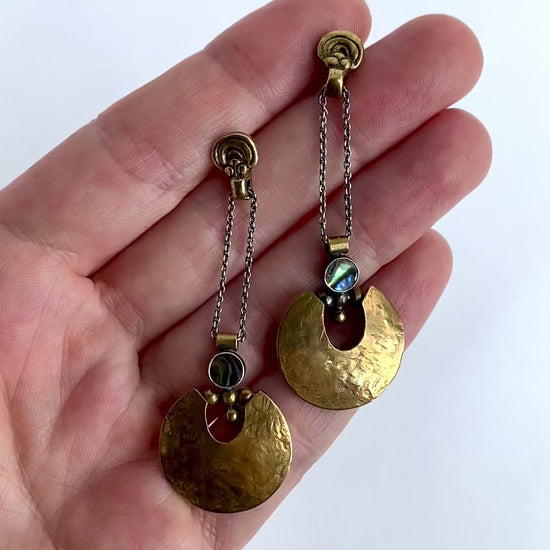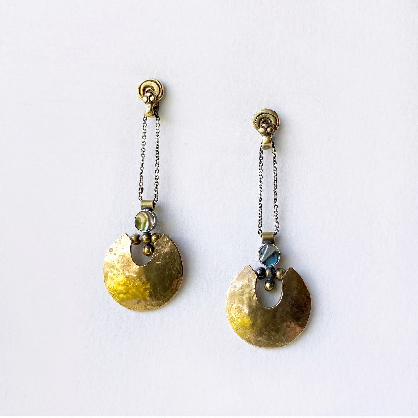The Eden earrings are the most unique in the collection. The many elements present represent the many realities we construct for ourselves as beings in the world while at the same time, keeping us grounded to mother earth. The earrings feature abalone shell, brass shell medallions, and brass beads. You won’t regret keeping these in your earring collection.