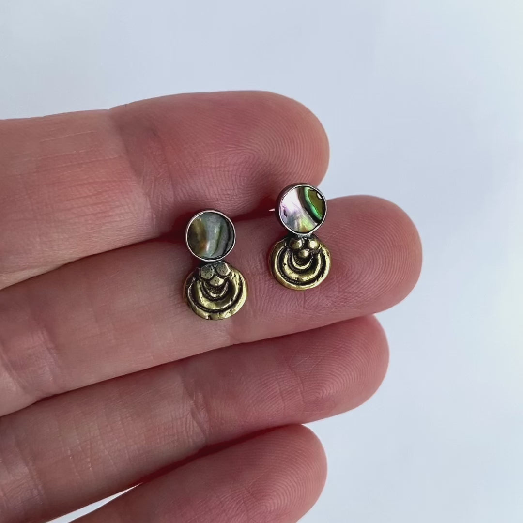 The Hera studs are inspired by divine femininity and the transformative power we as women possess. We transform in order to adapt, grow and understand our own vulnerability. Featuring abalone shell & a brass shell medallion, these studs are a gentle reminder to embrace these transformations because they are, afterall, a natural part of being present and real in this life.