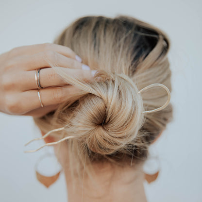 A simple twist on the original "pencil in the bun", these hammered brass hair pins will keep your locks tame and your style on point. Forged from raw brass, the hammered texture & curved shape ensures a proper hold.