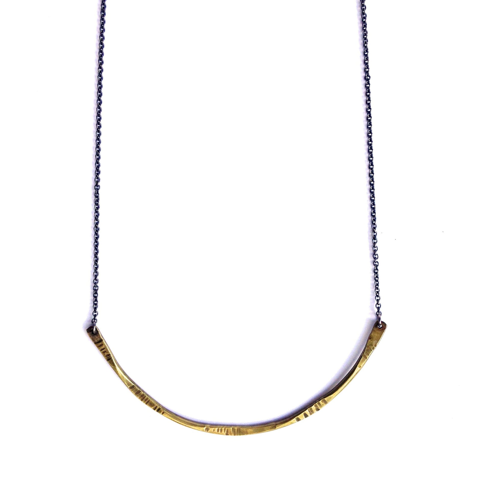 The Oba Necklace is a strong yet classic design, created for the simple beauty of everyday life. This necklace boasts a warm combination of a hammered oxidized brass half moon and an oxidize sterling silver chain. Dress up or down for a unique, powerful and beautiful look.